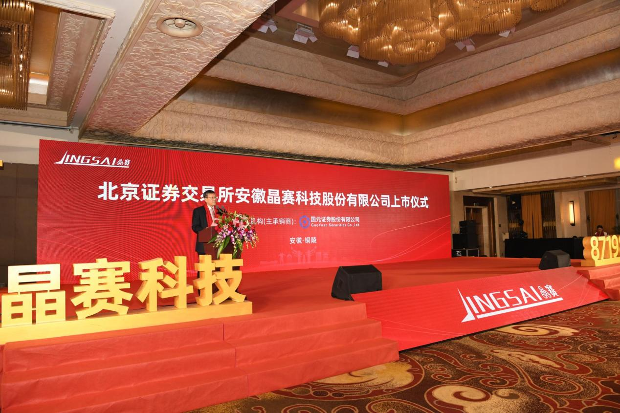 11月18日,安徽晶赛科技股份有限公司(股票代码“871981”,股票简称“晶赛科技”)举行北京证券交易所上市庆典仪式,庆贺成功登陆北京证券交易所。铜陵市政府常务副市长何田、安徽省地方金融监管局副局长程钢、铜陵经开区管委会主任周剑、安徽省证监局会计监管处处长戴见,国元证券党委书记、董事长俞仕新,国元资本董事长陈益民,国元证券副总裁廖圣柱,铜陵市地方金融监督管理局局长王陵峰等领导及铜陵市直部门、铜陵经济技术开发区相关部门负责人,中介机构、投资机构、金融机构、股东代表,铜陵市拟上市后备企业代表,客户代表、企业代表以及新闻媒体单位等共约150余人参加。